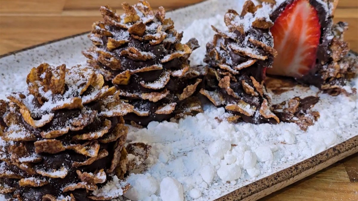 Para as pétalas da pinha, use cereal de milho com chocolate e, para finalizar, açúcar de confeiteiro peneirado por cima.